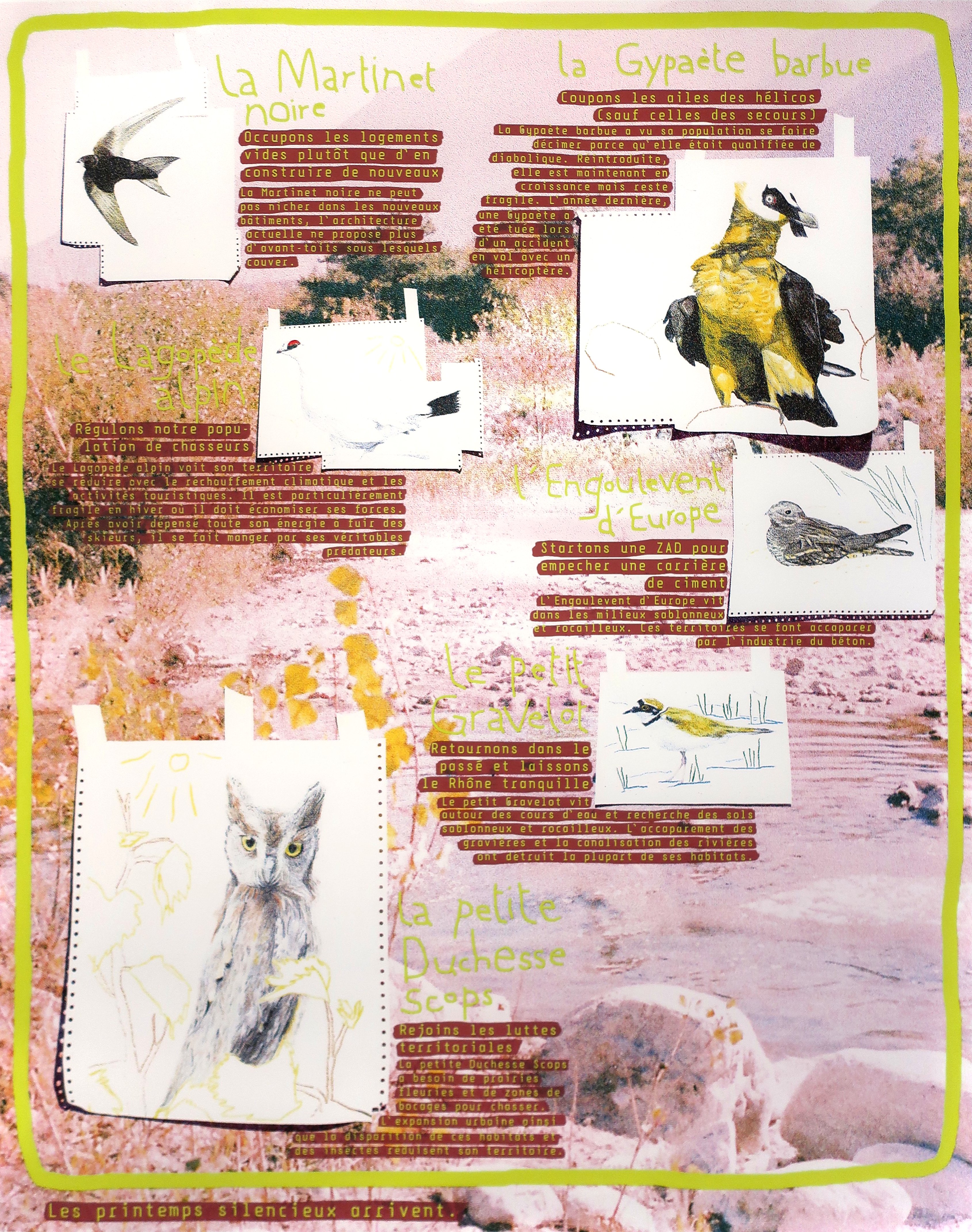 Lors de la réalisation de cette affiche, j’ai échangé avec deux ornithologues ainsi qu’une activiste Nord Vaudoise engagée en politique pour faire une sélection d’oiseaux dont les menaces couvrent un certain nombre de problématiques écologiques nationales et cantonales. Pour chaque espèce, je propose une invitation, un conseil pour leur venir en aide. J’utilise un ton pincé, humoristique, qui peint la situation dramatique. L’humour est une force face au désespoir que je ressens. Finalement, ces onze oiseaux dressent un portrait magnifique de la nature valaisanne ainsi qu’un paysage désastreux marqué par notre impact.
